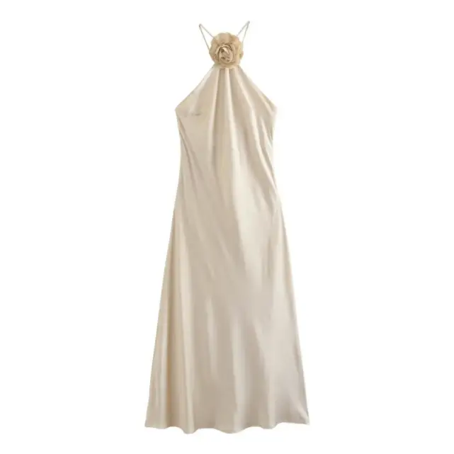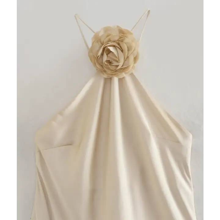 Son col haut orné d'une fleur sculpturale apporte une touche de romantisme et d’originalité, tandis que la coupe évasée assure un mouvement gracieux à chaque pas. Sa couleur champagne, lumineuse et raffinée, sublime toutes les carnations et offre un éclat discret mais sophistiqué.