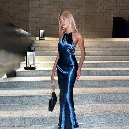 Découvrez notre robe satin bleu nuit dos nu, une pièce incontournable pour celles qui recherchent une robe de soirée élégante et tendance. Conçue en satin fluide et brillant, cette robe longue épouse parfaitement les courbes tout en offrant un tombé chic et raffiné.